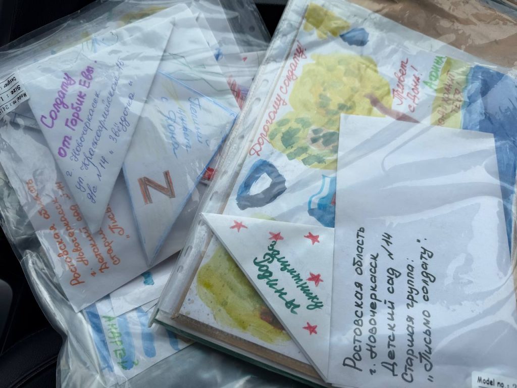 Волонтерское объединение из Новочеркасска «Донская сеть» передала нашим бойцам на фронт 30 маскировочных сетей актуальной расцветки. Для поднятия настроения военнослужащим к посылке добровольцы приложили письма с пожеланиями и поздравлениями, написанные детьми.