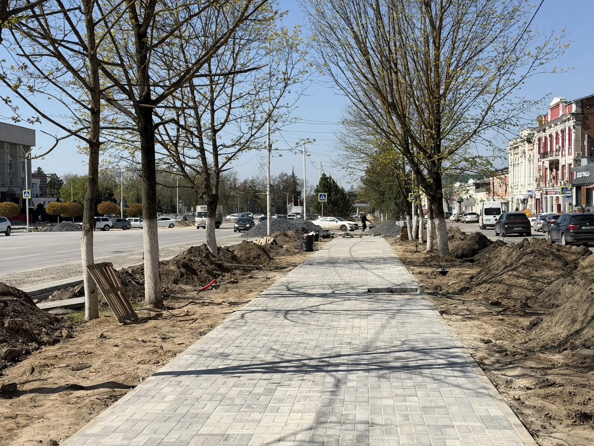 После зимнего перерыва работы на аллее продолжаются. Специалисты сняли старое покрытие, спилили и выкорчевали старые деревья. Уже проложены основные коммуникации. Подрядчик укладывает бортовой камень и плитку, устанавливает малые архитектурные формы, опоры и столбы освещения.