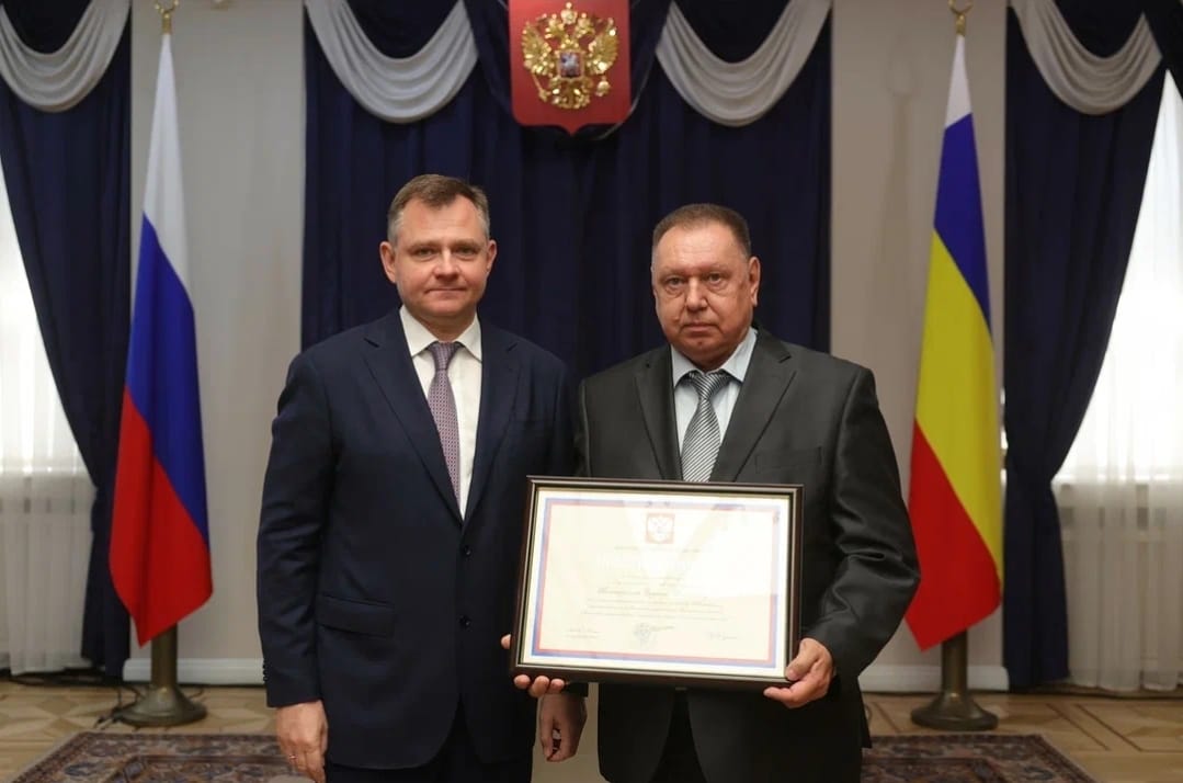 В торжественной обстановке врио губернатора Ростовской области Юрий Слюсарь вручил Сергею Шенкоренко, начальнику территориального отдела по городу Новочеркасску ГБУ Ростовской области «Аксайская межрайонная станция по борьбе с болезнями животных» почетную грамоту от имени президента РФ Владимира Путина.