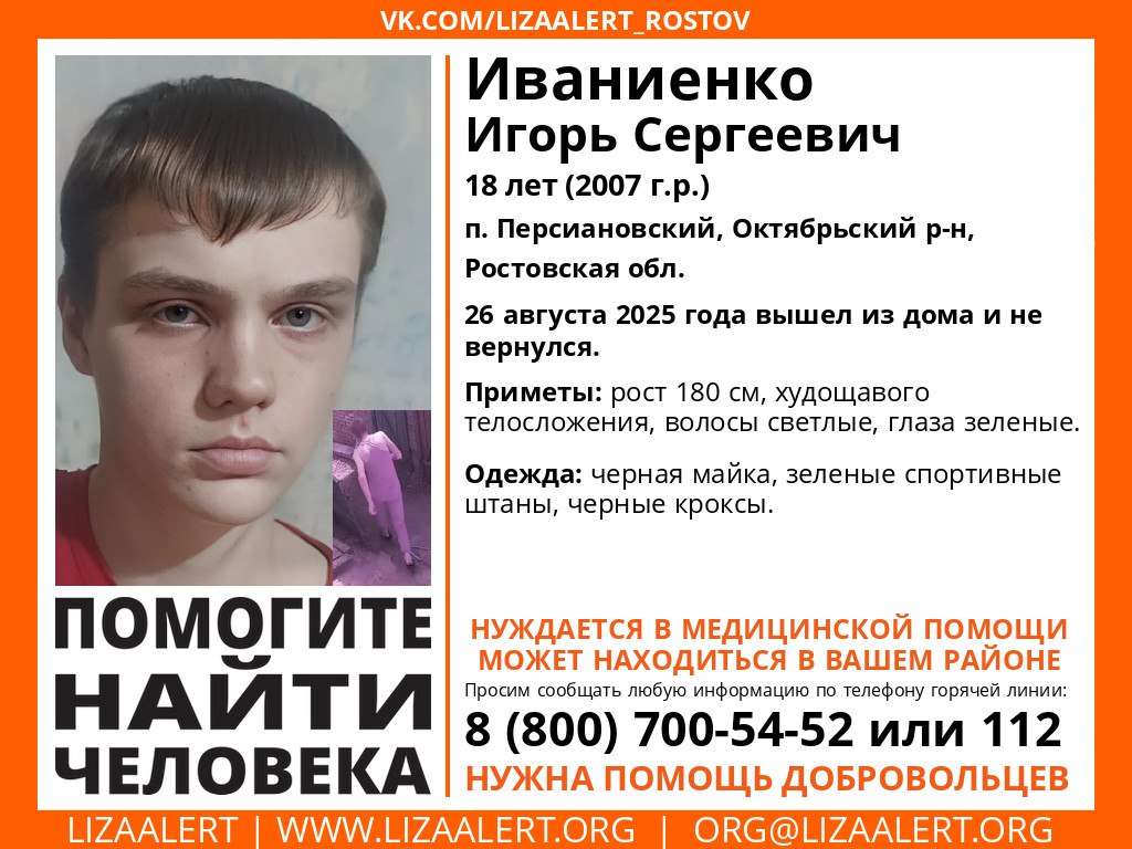 В поселке Персиановском, неподалеку от Новочеркасска, пропал 18-летний Игорь Иваниенко. Молодой человек нуждается в медицинской помощи, сообщили в поисковом отряде «ЛизаАлерт».