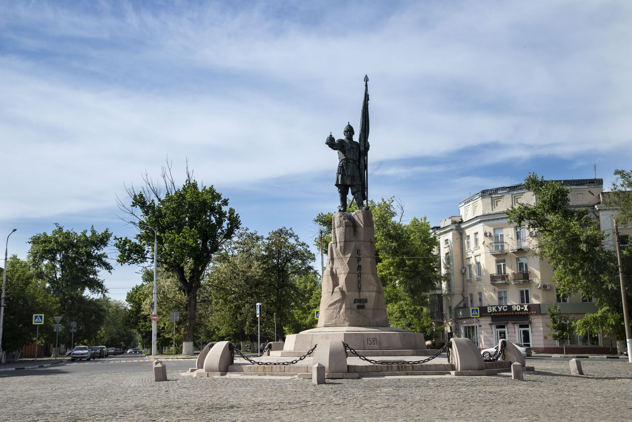 В Новочеркасске отреставрируют памятник Ермаку Тимофеевичу. Четырехметровый мемориал является объектом культурного значения федерального уровня. Памятник установлен на гранитном постаменте, окруженном цепями на гранитных опорах. Ермак в одной руке сжимает боевое знамя, а в другой — корону властителя покоренной им Сибири.