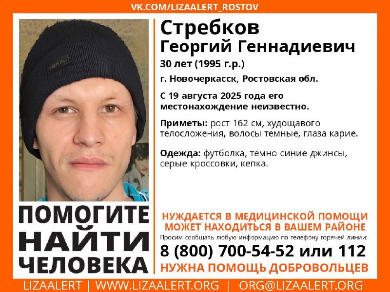 Поисковый отряд «ЛизаАлерт» объявил о поиске 30-летнего Георгия Стребкова. Мужчина проживал в Новочеркасске, но с 19 августа его местонахождение неизвестно.