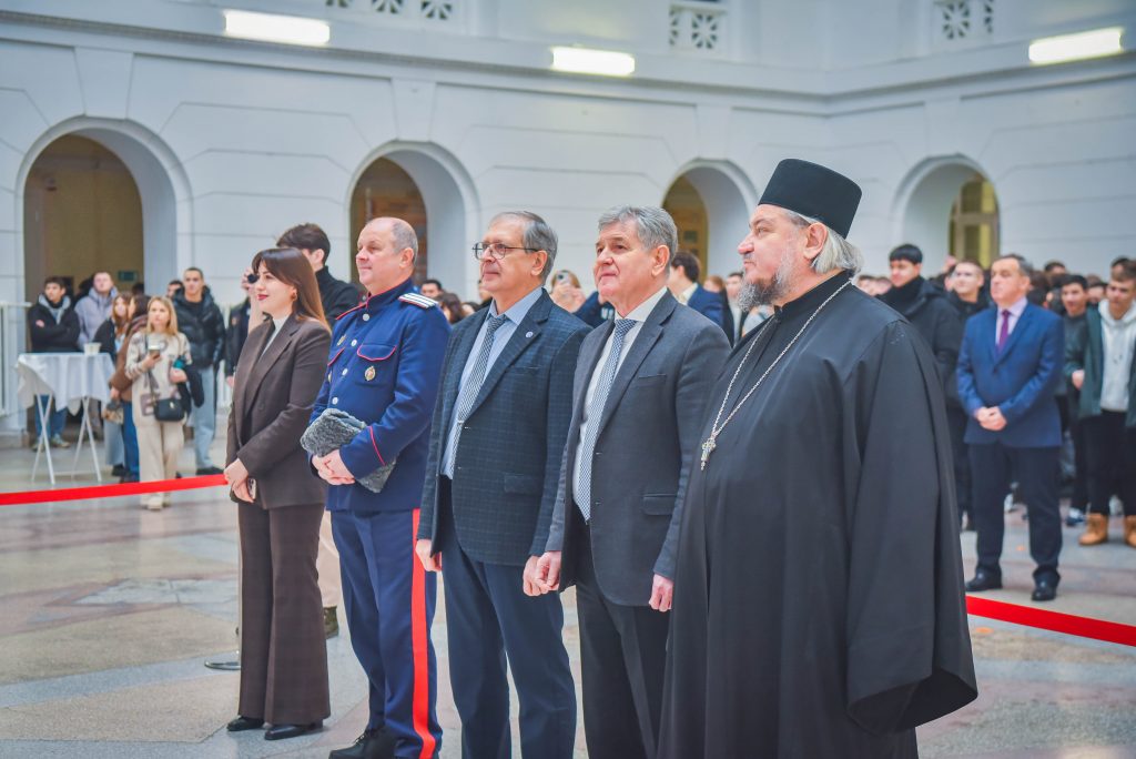 Начался праздничный день с утреннего молебна в честь святой Великомученицы Татианы, который провел иерей Алексий Мощевитин. К молитве присоединились проректор ЮРГПУ(НПИ) Евгений Журченко, атаман Новочеркасского округа ВКО ВВД казачий полковник Андрей Демченко, студенты и преподаватели.