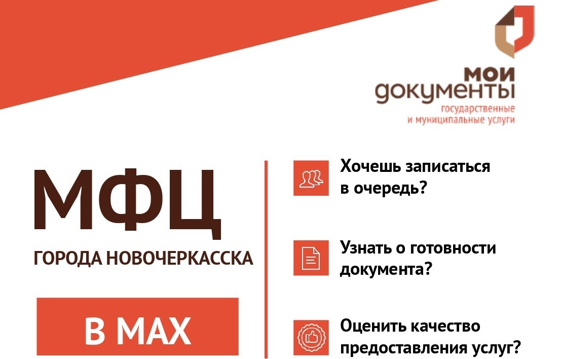 Жители Новочеркасска могут записаться в МФЦ через удобный чат-бот в мессенджере МАХ. Также с его помощью можно узнать статус готовности документа и оценить качество предоставления услуг. Для перехода в чат-бот перейдите по ссылке: https://max.ru/mfcnovoch_max_bot
